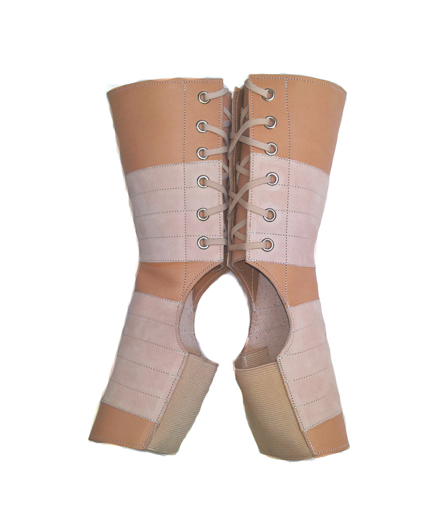 The suede panels provide extra grip for any static moves where the lower leg is wrapped around a rope or hoop, as well as drops to ankles, climbing a rope or silks etc.